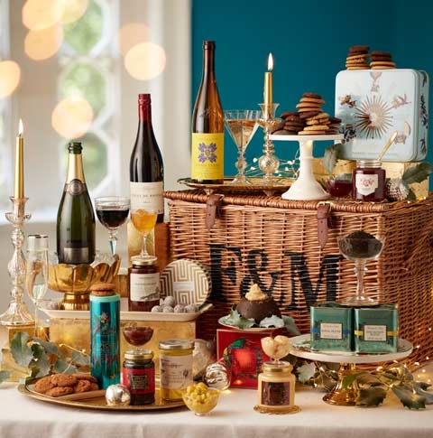 The Family Christmas Hamper is quite like its name suggests, it is for the family to enjoy a good day at home on Christmas. Laden with tins of loose leaf tea and coffee beans to go with Cognac butter, classic biscuits, harissa and salt lime nibbles, gold coins, and Marc de Champagne Truffles. St James Christmas Pudding and Marzipan Christmas Pudding are accompanied with Fortnum’s Beaujolais, Muscadet Sur Lie, Domaine Luneau, Brut Reserve N.V, Louis Roederer. There is a raspberry preserve and mulled cranberry and red onion marmalade to go with Christmas Reindeer bites. Sounds like a hamper worth shipping home or even better heading off to Piccadilly and purchasing it from the store for a lovely festive day with family.