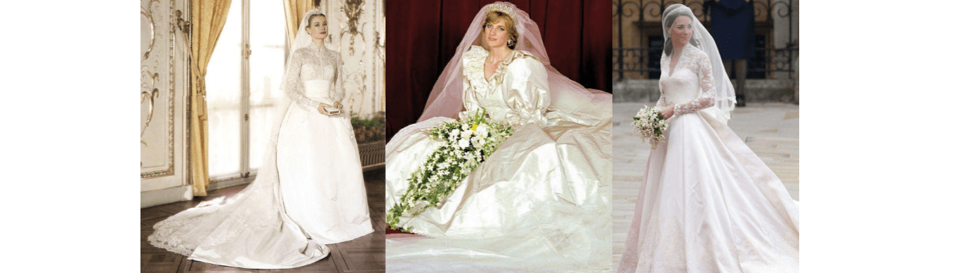 As another American actress enters the royal fold lets travel 62 years back to the wedding that took the world’s fancy and gave birth to the ‘Wedding of the Century’ moment in pop culture. MGM’s sweetheart and box office goddess Grace Kelly was getting married to Prince Rainier of Monaco in April of 1956. The wedding gown was a gift from MGM studio. Helen Rose – a costume designer at MGM and one who designed many costumes for Grace Kelly took 400 yards of fabric that included antique Belgian lace, Faille silk (a type of taffeta silk), tulle, and silk net. The dress had hundreds of hand-sewn seed pearls and more on the Juliet cap that held her veil. Beneath the lace bodice and pleated faille silk skirt were layers including a slip, underbodice, and skirt support, while the skirt train had the foundation, ruffled petticoats, and a train insert. The look was complete with a faille cummerbund that accented the restrained image of the gown. The dress was conservative and traditional while rendering a fairytale princess look to her persona. The long train of the veil was made with antique Belgian applique lace with motifs on the edges. Staying loyal to her era, Grace Kelly had the Holy Bible instead of a floral bouquet in hand while walking down the aisle. The bible was sewn with lace and embroidered with pearls to match the dress. Princess Grace of Monaco set a benchmark for a royal wedding gown in the books of fashion history. Brides both famous celebrities and otherwise have taken inspiration or have unabashedly mimicked her style for their wedding. One of such famous brides would be a royal bride herself but more on that as we go along the post.